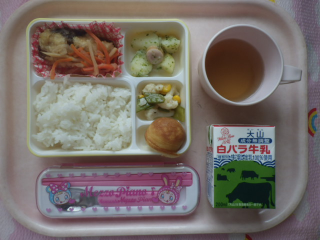 ホクホク★新じゃがの季節だよ! ★ごはん ◆●アジの南蛮漬け ★◆●じゃが芋のり塩炒め ●さやえんどうのサラダ ★プチケーキ ※あたたかいご飯はおかわり自由です。 ※牛乳は希望者のみです。 ★熱や力になるもの ◆血や肉になるもの ●体の調子を整えるもの ツイート