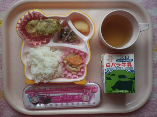 きのこのセンイでおなかのお掃除★ ★ごはん ◆鮭の磯部揚げ ◆●きのこと竹輪の炒め物 ●ゆかり和え ★りんごコンポート ※あたたかいご飯はおかわり自由です。 ※牛乳は希望者のみです。 ★熱や力になるもの ◆血や肉になるもの ●体の調子を整えるもの ツイート