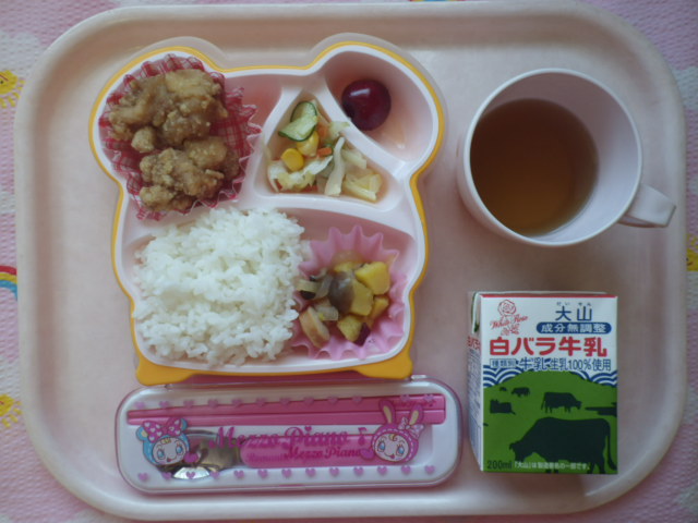 みんな大好き!から揚げだ★ ★ごはん ◆鶏のから揚げ ★◆●ポトフ ●コールスローサラダ ●アメリカンチェリー ※あたたかいご飯はおかわり自由です。 ※牛乳は希望者のみです。 ★熱や力になるもの ◆血や肉になるもの ●体の調子を整えるもの ツイート