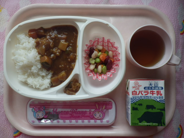 野菜いっぱい!栄養満点カレー★ ★ごはん ★◆●野菜カレー ●ビーンズサラダ ●福神漬け ※あたたかいご飯はおかわり自由です。 ※牛乳は希望者のみです。 ★熱や力になるもの ◆血や肉になるもの ●体の調子を整えるもの ツイート