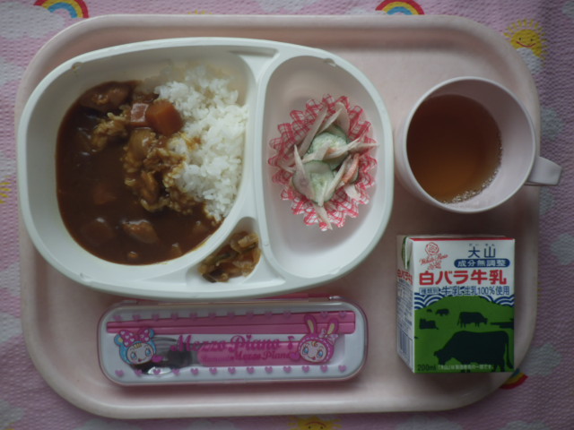 カレーを食べて元気もりもり! ★ごはん ★◆●チキンカレー ●ごぼうサラダ ●福神漬け ※あたたかいご飯はおかわり自由です。 ※牛乳は希望者のみです。 ★熱や力になるもの ◆血や肉になるもの ●体の調子を整えるもの ツイート