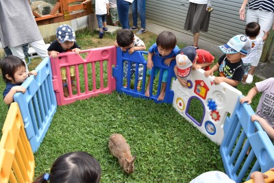 園庭では、砂場やすべり台、ブランコなどをしたり、芝生の上を走ってみたり、ウサギの親子(赤ちゃんウサギが生まれました!)やカメの様子を見たりして、久しぶりの晴れ間に、外あそびを楽しみました!かわいいニコニコ笑顔がたくさん見られました!(*^_^*)