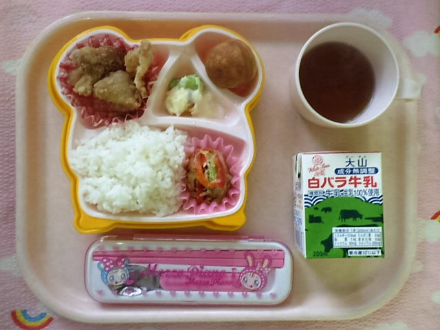 お弁当の定番★から揚げだ! ★ごはん ◆鶏の竜田揚げ ◆●キャベツツナ炒め ★●さつま芋サラダ ★プチケーキ ※あたたかいご飯・カレーはおかわり自由です。 ※牛乳は希望者のみです。 ★熱や力になるもの ◆血や肉になるもの ●体の調子を整えるもの ツイート