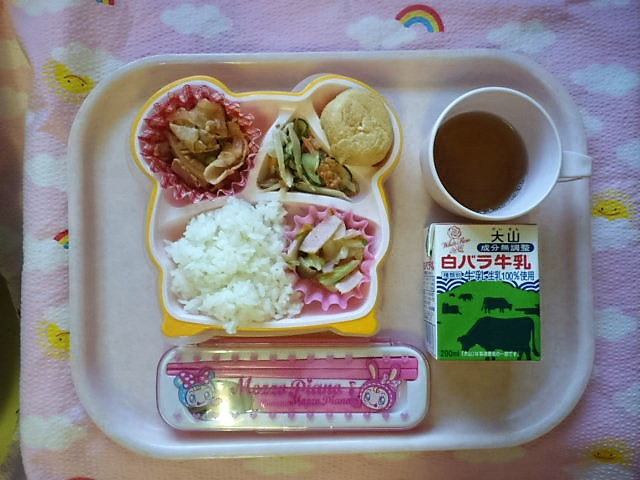 ごぼうのセンイでお腹のお掃除★ ★ごはん ◆●ポークチャップ ◆●白菜ベーコン煮 ●ごぼうサラダ ★シュークリーム ※あたたかいご飯・カレーはおかわり自由です。 ※牛乳は希望者のみです。 ★熱や力になるもの ◆血や肉になるもの ●体の調子を整えるもの ツイート