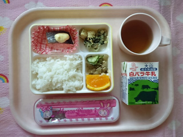 鮭とマヨネーズ★相性バッチリ! ★ごはん ◆鮭のマヨネーズ焼き ◆●豆腐チャンプルー ◆●大根の塩昆布和え ●オレンジ ※あたたかいご飯・カレーはおかわり自由です。 ※牛乳は希望者のみです。 ★熱や力になるもの ◆血や肉になるもの ●体の調子を整えるもの ツイート