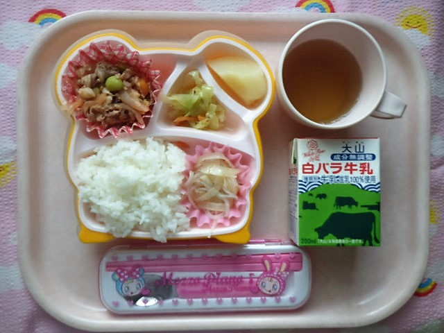 トマトでコトコト★おいしくなぁれ! ★ごはん ◆●牛と豆のトマト煮 ◆●春雨ソテー ●コールスローサラダ ★洋ナシ缶 ※あたたかいご飯・カレーはおかわり自由です。 ※牛乳は希望者のみです。 ★熱や力になるもの ◆血や肉になるもの ●体の調子を整えるもの ツイート