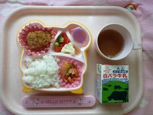 カレー味で食欲もアップ! ★ごはん ◆タラのカレー揚げ ◆●野菜のトマト煮 ●フレンチサラダ ★ゼリー ※あたたかいご飯・カレーはおかわり自由です。 ※牛乳は希望者のみです。 ★熱や力になるもの ◆血や肉になるもの ●体の調子を整えるもの ツイート
