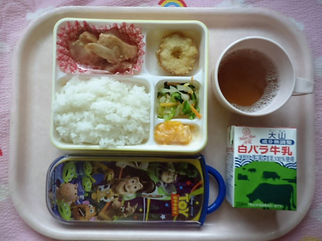 山陰の名物★あご野焼をどうぞ! ★ごはん ★テリヤキチキン ◆あご野焼の天ぷら ●白菜のゆず和え ★◆フルーツヨーグルト ※あたたかいご飯・カレーはおかわり自由です。 ※牛乳は希望者のみです。 ★熱や力になるもの ◆血や肉になるもの ●体の調子を整えるもの ツイート