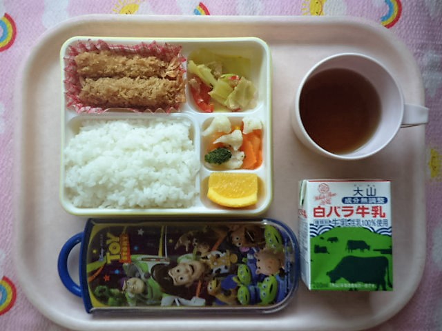 サクサク楽しい★エビフライ! ★ごはん ◆エビフライ ◆●キャベツツナ炒め ●ブロッコリーサラダ ●オレンジ ※あたたかいご飯・カレーはおかわり自由です。 ※牛乳は希望者のみです。 ★熱や力になるもの ◆血や肉になるもの ●体の調子を整えるもの ツイート