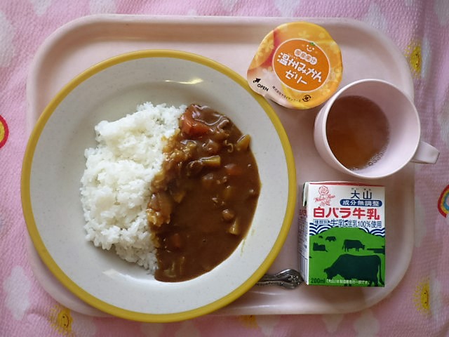 おいしさがギュウ★ビーフカレー ★ごはん ★◆●ビーフカレー ★みかんゼリー ※あたたかいご飯・カレーはおかわり自由です。 ※牛乳は希望者のみです。 ★熱や力になるもの ◆血や肉になるもの ●体の調子を整えるもの ツイート