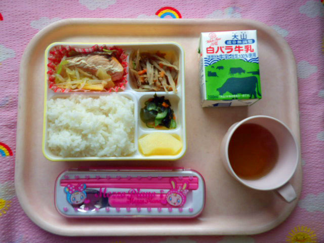 お酢のパワーで元気いっぱい!!(2016/2/13) ★ ごはん ◆●鮭のちゃんちゃん焼き ◆●きんぴらごぼう ● 酢の物 ★ 洋ナシ缶 ※あたたかいご飯はおかわり自由です。 ※牛乳は希望者のみです。 ★熱や力になるもの ◆血や肉になるもの ●体の調子を整えるもの ツイート