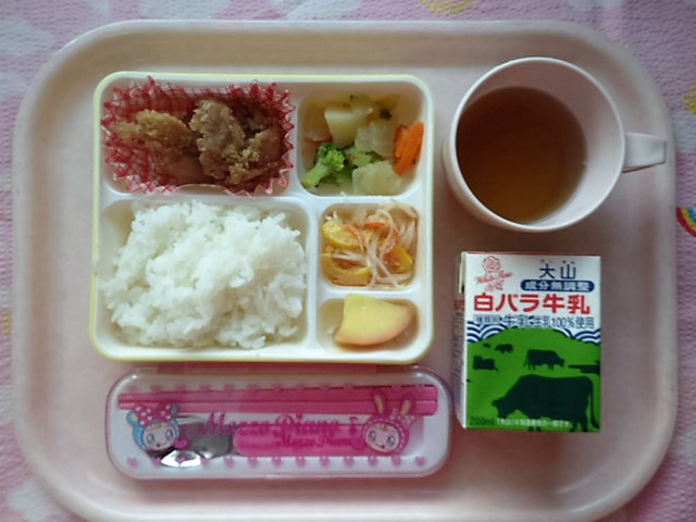 みんな大好き★から揚げだ! ★ごはん ◆鶏のから揚げ ★●コンソメ煮 ●春雨サラダ ★りんごコンポート ※あたたかいご飯はおかわり自由です。 ※牛乳は希望者のみです。 ★熱や力になるもの ◆血や肉になるもの ●体の調子を整えるもの ツイート