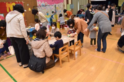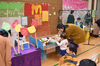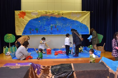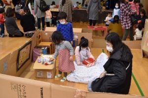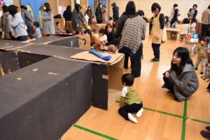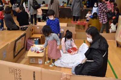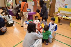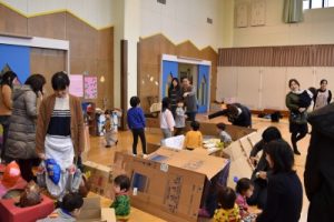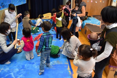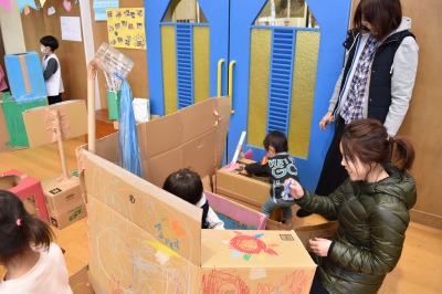 そんな寒い日にもかかわらず、49組の親子のみなさんが、遊びに来てくださいました!今回は、大きな段ボールを使って、年長組のお兄さん、お姉さんが作品展に向けて作った、大型作品で遊びました!