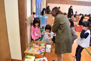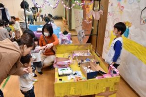 大型作品には、「おうち」「ゲームコーナー」「きらきらしょっぴんぐ」「どうくつめいろ」、コンビニやマック、さかなつりができるコーナーなど、楽しそうな作品が、いっぱいです(^^♪そして、年長組のお兄さん、お姉さんが、遊び方を教えてくれたり、一緒に遊んでくれました(^^)