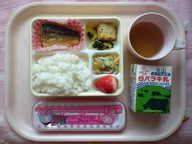 今日のお魚さんは蒲焼き風だよ★ ★ごはん ◆サバの蒲焼き風 ◆●厚揚げと青菜炒め ◆●しらす和え ●いちご ※あたたかいご飯はおかわり自由です。 ※牛乳は希望者のみです。 ★熱や力になるもの ◆血や肉になるもの ●体の調子を整えるもの ツイート