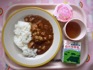 あったかカレー★たくさん食べてね! ★ごはん ★◆●チキンカレー ★ももゼリー ※あたたかいご飯はおかわり自由です。 ※牛乳は希望者のみです。 ★熱や力になるもの ◆血や肉になるもの ●体の調子を整えるもの ツイート