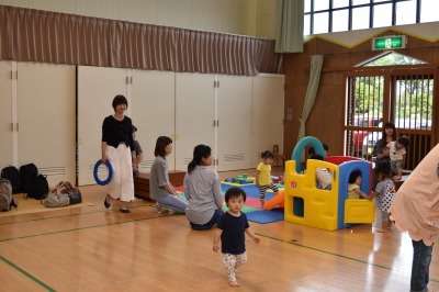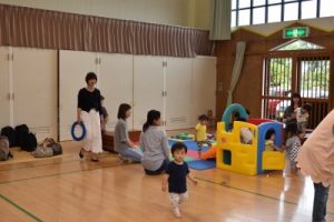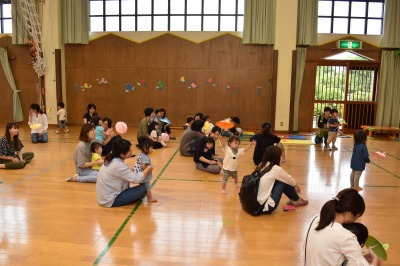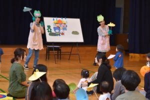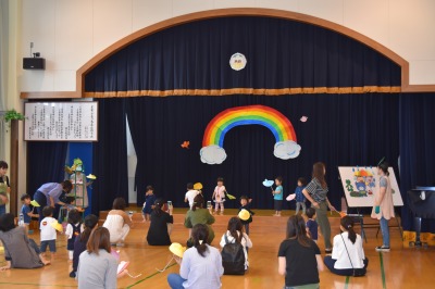 かえるくんの傘をさしながら、「カエルの合唱」をみんなで歌ったり、親子でふれあい遊びをして楽しみました♪