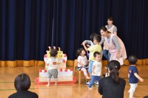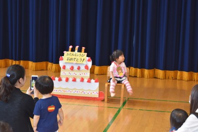 そして、みんなで集まって、6月生まれのお友だちの誕生会をしました。「たんたんたんたん たんじょうび~♪」とみんなで歌ってお祝いしました(^^♪これからも、元気にすくすく大きくなってね!!