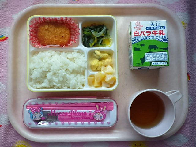 つぶつぶコーンのコロッケだ★(2017/6/28) ★ ごはん ★●コーンコロッケ ◆●ほうれん草ソテー ★●かぼちゃサラダ ★◆フルーツヨーグルト ※あたたかいご飯はおかわり自由です。 ※牛乳は希望者のみです。 ★熱や力になるもの ◆血や肉になるもの ●体の調子を整えるもの ツイート