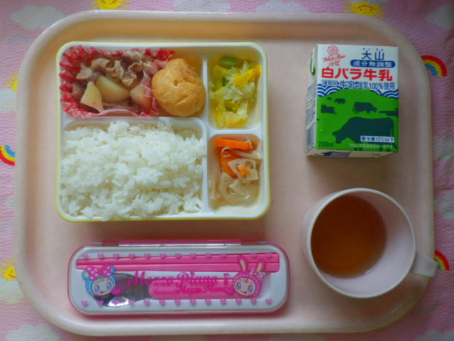 シャキシャキ☆れんこんきんぴら☆(2017/10/6) ★ ごはん ★◆●肉じゃが ◆●れんこんきんぴら ● グリーンサラダ ★ シュークリーム ※あたたかいご飯はおかわり自由です。 ※牛乳は希望者のみです。 ★熱や力になるもの ◆血や肉になるもの ●体の調子を整えるもの ツイート