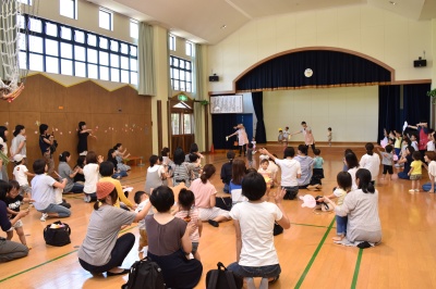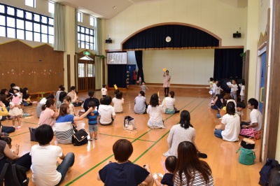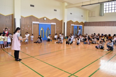 外でたくさん遊んだ後は、遊戯室に集まって、お楽しみの「わくわくタイム」の時間です。