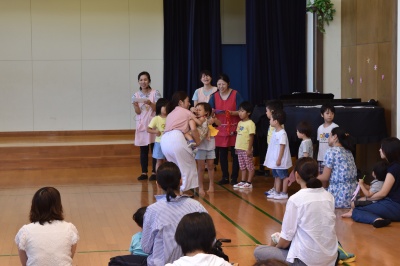 楽しく遊んだ後は、誕生会をしました。年長組の子どもたちからペンダントを受け取って、みんなで御祝いをしましたよ。