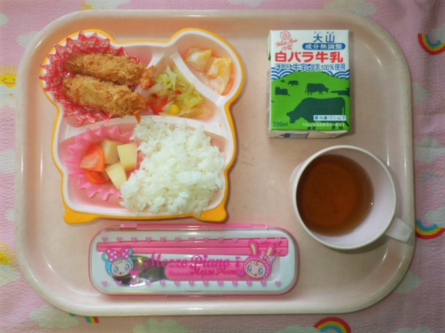 みんな大好き★エビフライ♪♪(2018/1/19) ★ ごはん ◆ エビフライ ★◆●ポトフ ● コールスローサラダ ★◆フルーツヨーグルト ※あたたかいご飯はおかわり自由です。 ※牛乳は希望者のみです。 ★熱や力になるもの ◆血 や肉になるもの ●体の調子を整えるもの ツイート