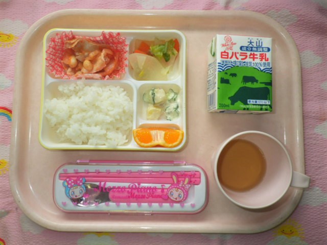 冬がおいしい♪みかんの登場!(2018/1/24) ★ ごはん ◆●ポークビーンズ ● 冬野菜のコンソメ煮 ★●さつま芋サラダ ● みかん ※あたたかいご飯はおかわり自由です。 ※牛乳は希望者のみです。 ★熱や力になるもの ◆血 や肉になるもの ●体の調子を整えるもの ツイート