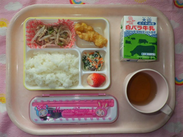 今日の給食(2018/4/16) ★ ごはん ◆●牛もやし炒め ● 玉ねぎかき揚げ ◆●白和え ● いちご ※あたたかいご飯はおかわり自由です。 ※牛乳は年長・年中希望者のみです。 ★熱や力になるもの ◆血や肉になるもの ●体の調子を整えるもの ツイート