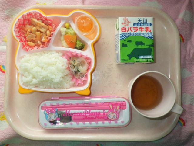 今日の給食(2018/4/23) ★ ごはん ◆●ポークビーンズ ◆●春雨ソテー ● ブロッコリーサラダ ★ ゼリー ※あたたかいご飯はおかわり自由です。 ※牛乳は年長・年中希望者のみです。 ★熱や力になるもの ◆血や肉になるもの ●体の調子を整えるもの ツイート
