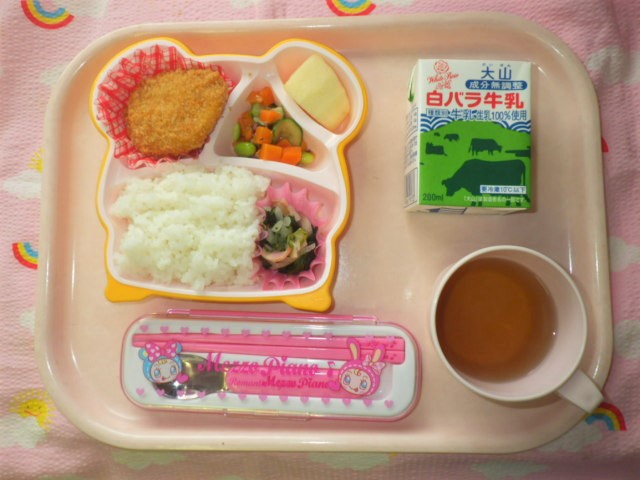 今日の給食(2018/4/25) ★ ごはん ● かぼちゃコロッケ ◆●ほうれん草ソテー ◆●ビーンズサラダ ● りんご ※あたたかいご飯はおかわり自由です。 ※牛乳は年長・年中希望者のみです。 ★熱や力になるもの ◆血や肉になるもの ●体の調子を整えるもの ツイート
