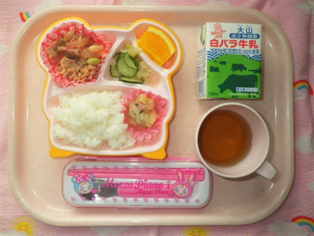 今日の給食(2018/5/18) ★ ごはん ◆●牛と豆のトマト煮 ★◆●ジャーマンポテト ● グリーンサラダ ● オレンジ ※あたたかいご飯はおかわり自由です。 ※牛乳は年長・年中希望者のみです。 ★熱や力になるもの ◆血や肉になるもの ●体の調子を整えるもの ツイート