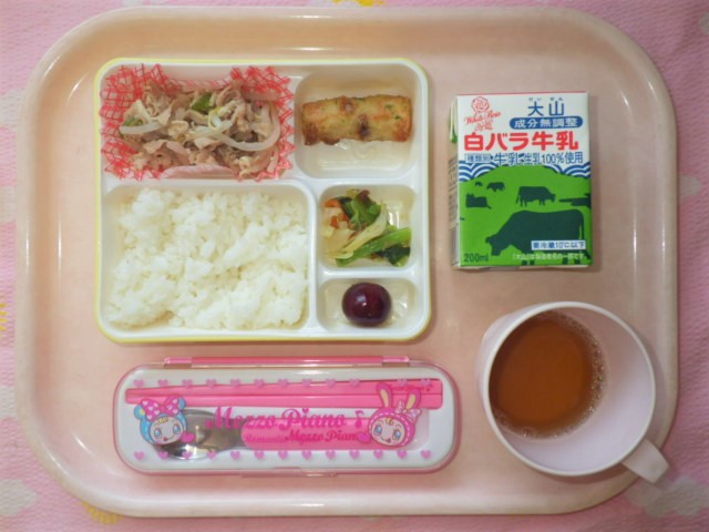 今日の給食(2018/5/25) ★ ごはん ◆●牛もやし炒め ◆ ちくわの磯部天ぷら ◆●おかか和え ● アメリカンチェリー ※あたたかいご飯はおかわり自由です。 ※牛乳は年長・年中希望者のみです。 ★熱や力になるもの ◆血や肉になるもの ●体の調子を整えるもの ツイート