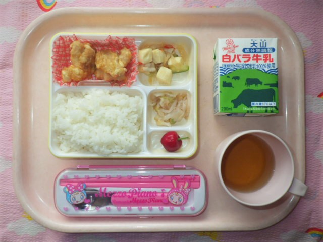 今日の給食(2018/6/4) ★ ごはん ◆ 鶏のあられ揚げ ◆●炒り豆腐 ● キャベツの梅和え ● アメリカンチェリー ※あたたかいご飯はおかわり自由です。 ※牛乳は年長・年中希望者のみです。 ★熱や力になるもの ◆血や肉になるもの ●体の調子を整えるもの ツイート