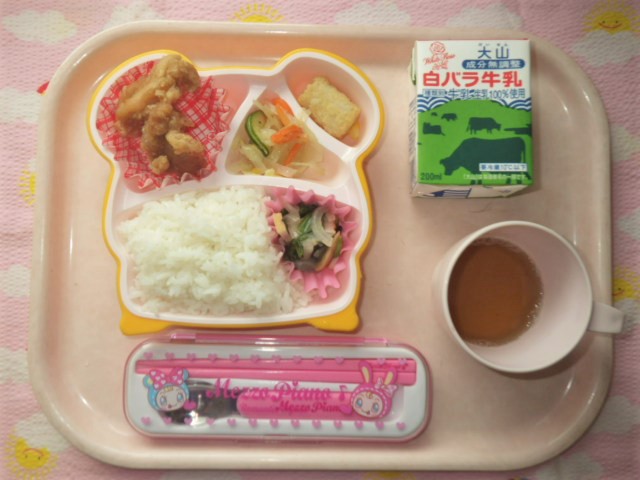 今日の給食(2018/6/11) ★ ごはん ◆ とりのから揚げ ◆●ほうれん草ソテー ● コールスローサラダ ★ フライドポテト ※あたたかいご飯はおかわり自由です。 ※牛乳は年長・年中希望者のみです。 ★熱や力になるもの ◆血や肉になるもの ●体の調子を整えるもの ツイート