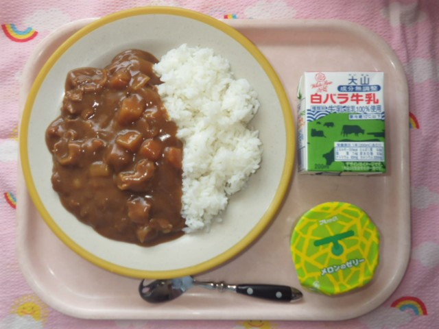 今日の給食(2018/6/25) ★ ごはん ★◆●ビーフカレー ★ メロンゼリー ※あたたかいご飯とカレーはおかわり自由です。 ※牛乳は年長・年中希望者のみです。 ★熱や力になるもの ◆血や肉になるもの ●体の調子を整えるもの ツイート