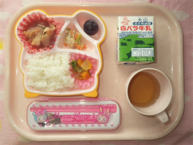 今日の給食(2018/6/27) ★ ごはん ◆●チキントマトソース ● ポトフ ◆●アスパラのサラダ ● ぶどう ※あたたかいご飯はおかわり自由です。 ※牛乳は年長・年中希望者のみです。 ★熱や力になるもの ◆血や肉になるもの ●体の調子を整えるもの ツイート