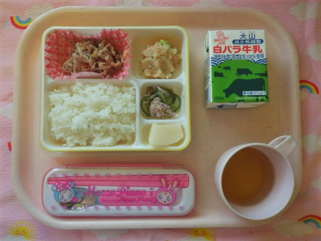 鳥取県の名産☆梨の登場(2018/9/3) ★ ごはん ◆●牛もやし炒め ◆●卯の花 ● ゆかり和え ● 梨 ※あたたかいご飯はおかわり自由です。 ※牛乳は年長・年中希望者のみです。 ★熱や力になるもの ◆血や肉になるもの ●体の調子を整えるもの ツイート