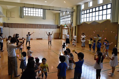わくわくタイムでは、きらきらステッキを持って「おどるポンポコリン」をみんなで踊ったり、親子でふれあい遊びをしたりしました。たくさん触れ合って、たくさんの嬉しそうな笑顔がいっぱいでしたね(^^)お家でも ぜひ楽しんで下さいね!
