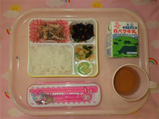 ひじきで鉄分を補給しよう!(2018/10/5) ★ ごはん ◆●豚肉のポン酢炒め ● ひじき煮 ◆●煮浸し ★ ゼリー ※あたたかいご飯はおかわり自由です。 ※牛乳は年長・年中希望者のみです。 ★熱や力になるもの ◆血や肉になるもの ●体の調子を整えるもの ツイート