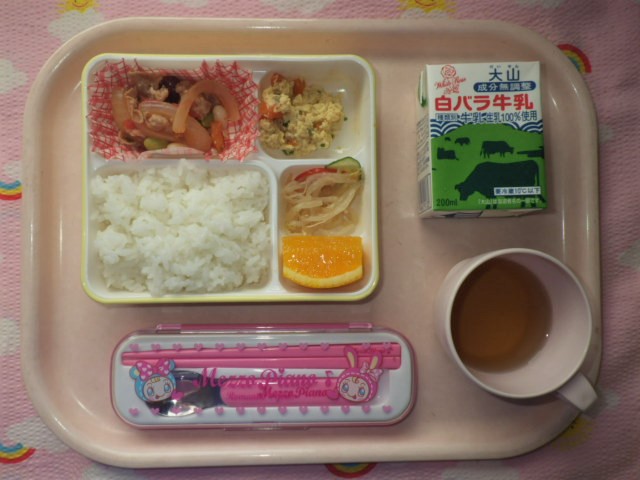 カラフルお豆のトマト煮だよ♪(2018年11月9日) ★ ごはん ◆ 牛と豆のトマト煮 ◆●スクランブルエッグ ◆●バンバンジーサラダ ● オレンジ ※牛乳は年長・年中希望者のみです。 ★熱や力になるもの ◆血や肉になるもの ●体の調子を整えるもの ツイート