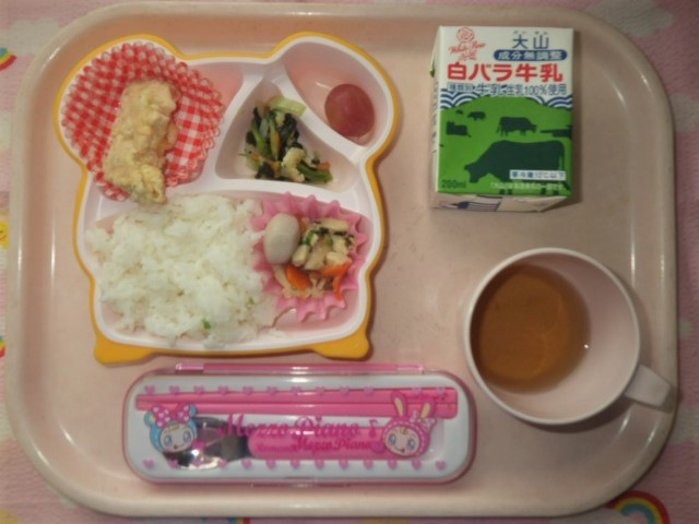 ゆかりでサッパリ☆鮭の天ぷら(2018年11月12日) ★ ごはん ◆ 鮭のゆかり天ぷら ★◆●高野と野菜の含め煮 ◆●お浸し ● ぶどう ※あたたかいご飯はおかわり自由です。 ※牛乳は年長・年中希望者のみです。 ★熱や力になるもの ◆血や肉になるもの ●体の調子を整えるもの ツイート