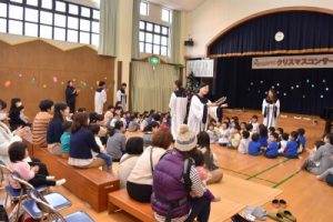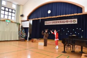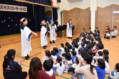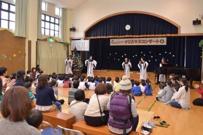 クリスマスを目前にしたこの日は、26組の親子のみなさんと在園児が、ゴスペルオーブさんによる素敵な歌をたくさん聴かせていただきました♪ 「赤鼻のトナカイ」「あわてんぼうのサンタクロース」「アイアイ」「オーシャンゼリゼ」など、表情豊かでパワフルな歌声に、みんなで一緒に口ずさんだり、リズムに乗って体を動かしたりと、会場一体となって楽しみました! ゴスペルオーブのみなさん、元気とパワーをいただき、ありがとうございました(^^)v♪