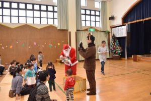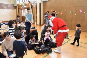 誕生会が終わると、どこからか鈴の音が聞こえてきて… カーテンからひょっこり顔を覗かせて、おちゃめなサンタさんとトナカイさんが登場!! よいこの子どもたちに、リースのプレゼントを手渡しました。 かわいい笑顔がたくさん見られ、遊戯室は温かい雰囲気に包まれました♡