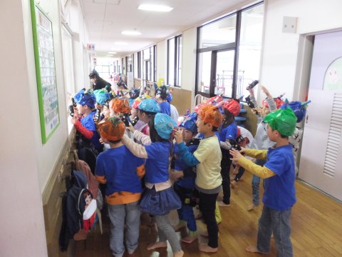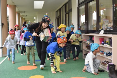 スライドを見た後に、悪い心を持つ子どもたちを仲間にしようと、何人も鬼がやって、子どもたちを脅かしましたが、みんなは強い心で力を合わせ、豆を投げ、鬼たちを追い返すことができました。