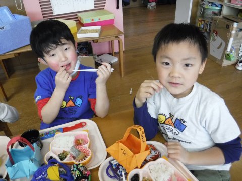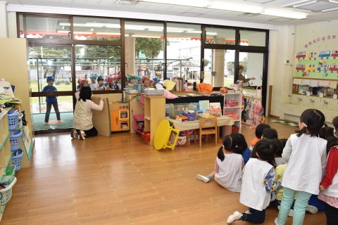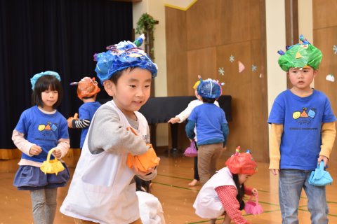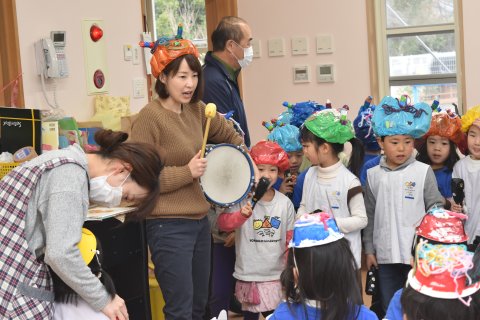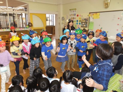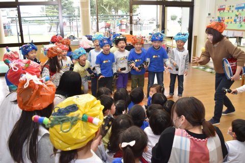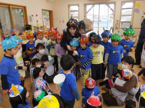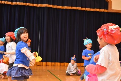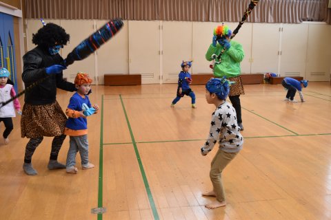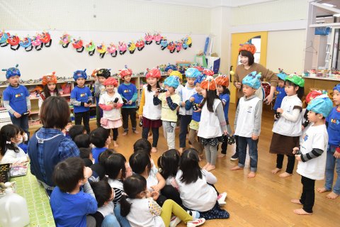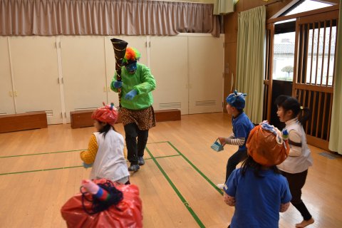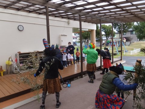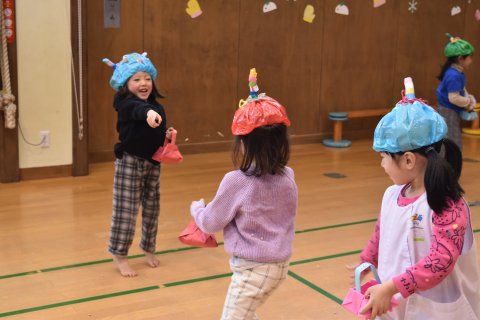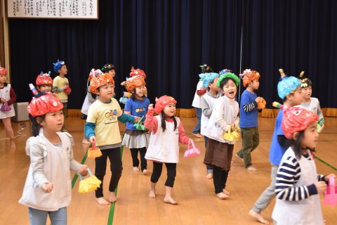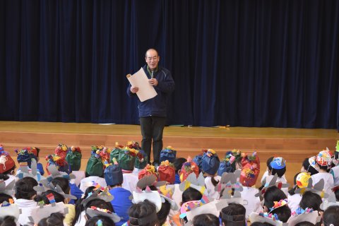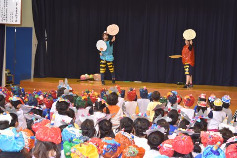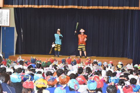 その後、園長先生から豆まきの由来の話を聞いたり、寸劇を観たり、スライドを観たりして楽しみました。