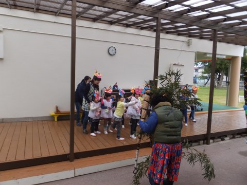 最初に年長組の子どもたちが扮する鬼が、子どもたちの心の中に悪い鬼がいないか聞きながら教室を回りました。