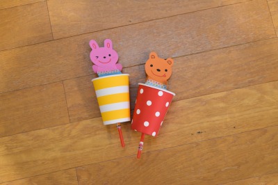 おはなし会にちなんで、今回のおみやげは「紙コップの飛び出す人形」です。うさぎやくまがピョコンと出たり入ったり…。おうちでたくさん遊んでくださいね♪