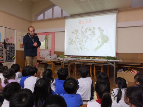 スライドを使って七草粥の由来や、野草についての説明などをみたり、実際に使われている野草をみたりしました。