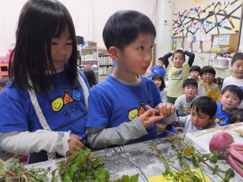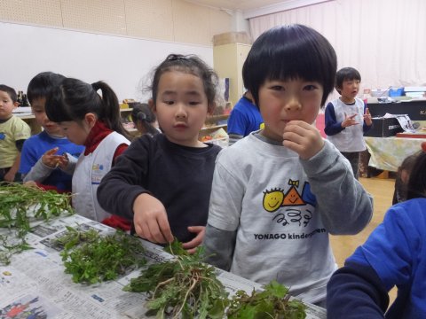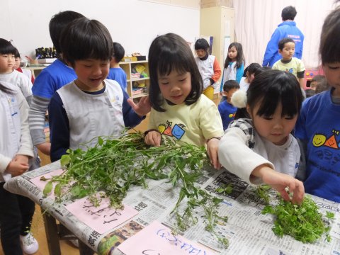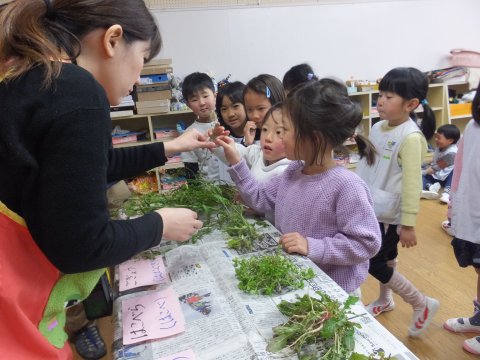 子どもたちは、園長先生から、これは小学校で習うような事だと聞き、逆に張り切って七草の名前を覚えたり、野草をみたりしていました。